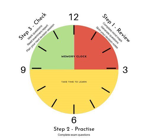 The Memory Clock is an easy-to-learn revision routine designed to help students structure their time in such a way as to make revision focused and productive. The three memorable steps below outline how to best spend one hour of revision!
